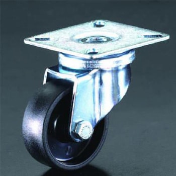 ボールベアリング。プレート取付け型。リムは耐衝撃性のあるナイロン6製。自在旋回部内にボールベアリング仕様の自在取付け金具。オイルを除く強力な物質に対する耐薬品性があります。タイヤは床に跡が付きにくくなっています。軽荷重タイプ。耐熱温度30℃以上では負荷容量が減少します。