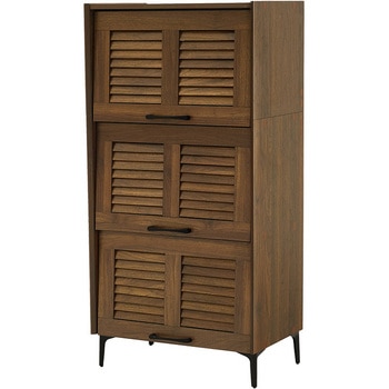 フラップ扉&ルーバー扉のシューズラック幅と高さにゆとりを持たせた設計で、出し入れスムーズ。奥行きも深めなので、最大32.5cmまでの大きめの靴も収納可能。高さ調節できる便利な棚板が3枚お持ちの靴に合わせて、3段階で調節できます。可動棚を外せば高さ31cmまでの背の高い靴も収納OK!扉はルーバー仕様、背面に通気口で通気性に優れた設計においや湿気がこもりにくいです。玄関だけでなく、リビング収納としても活躍◎通気口をコード穴として活用することもできます!リアルな木の質感を感じられる3色からお選びください。【商品サイズ(約)】幅61×奥行38(開扉時42.5)×高さ122cm【梱包サイズ(約)】80×43×24cm(30kg)【材質】プリント紙化粧パーティクルボード【生産国】マレーシア【備考】組立品(プラスドライバーとハンマーが必要)