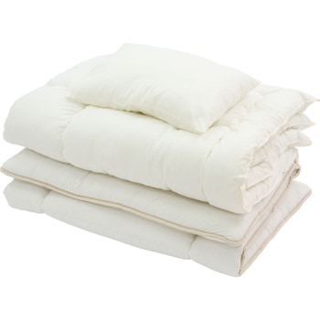 セット内容掛布団、敷布団、枕、布団ケース材質[掛布団]側生地:ポリエステル85%・綿15%、中綿:ホワイトダックダウン90%・フェザー10%、[敷布団]側生地:ポリエステル85%・綿15%、巻綿:ポリエステル100%(東洋紡フィルハーモニィ(R))、中芯:プロファイルウレタン5cm厚、[枕]側生地・中綿:ポリエステル100%、[布団ケース]不織布質量(kg)[掛布団](約)1、[敷布団](約)3.2、[枕](約)0.5寸法(cm)[掛布団](約)150×210、[敷布団](約)100×210、[枕](約)43×63、[布団ケース](約)103×66×42