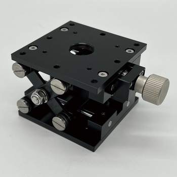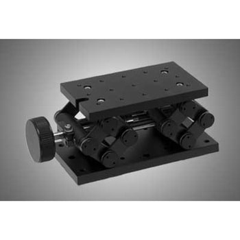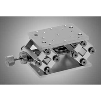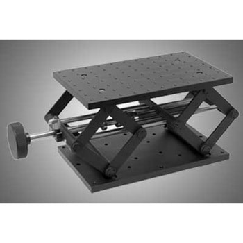 ・大型精密ラボジャッキは、移動ガイドにパンタグラフ式を採用し、重量物の高さ調整ができる大型ラボジャッキです。・移動量 100mm、耐荷重 294N(30kgf)にて、垂直移動できます。・ハンドルを回転することにより、ステージ面を垂直移動できます。・クランプ(ハンドル付近)にて、昇降動作の固定・開放をします。・ステージ面のM4タップ(ピッチ 25mm)を利用して、機器を取り付けられます。・下側部品(下面ステージ)の固定穴(4ヶ所)は、□100.8mm位置であり、ミリ 及び インチ仕様への接続が可能です。・黒アルマイト仕上げのアルミ製で、機構部はステンレス製、黒色塗装の真鍮製です。