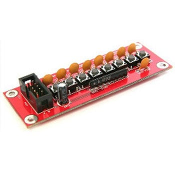 8個のタクトスイッチ入力モジュールです。 ポートを入力設定にしてスイッチのON/OFF状態を判定することができます。 スイッチが押されていれば 1' が、押されていなければ '0' がポートに入力されます。 AVRなどポートの入出力を指定しなければならないMCUを使用する場合には、 該当ポートのDDRレジスタ(入出力設定レジスタ)を入力設定にしてご使用ください。