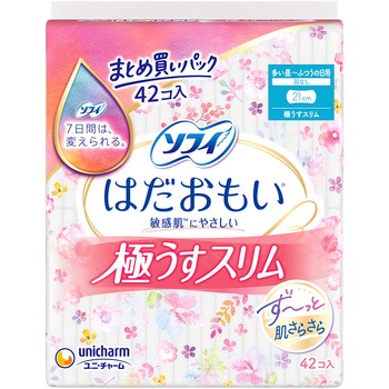 生理中の敏感肌TMにやさしい、はだおもい極うすスリム●「はだおもいシート」が、経血を表面に残さずしっかり吸収。だから、肌のサラサラ感が続き、肌にやさしい。●極上のやわらかな肌ざわり。●製品の裏側には、ナチュラルフラワーデザインを採用。●軽い日にぴったりの17.6cmなので、つけていないような軽やかなつけ心地で過ごせる。<以下注釈>医薬部外品