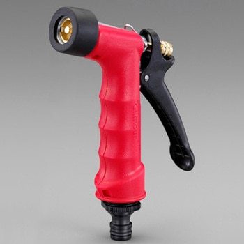 15mm用ステム・ホースバンド付。トリガー材質はABS樹脂。ハンドル材質は 熱可塑性ゴム(TPR)。片手で操作できるトリガーロックで、快適な連続使用が可能。水量調節ツマミ付。スプレーパターン2種(ストリーム、ミスト)。