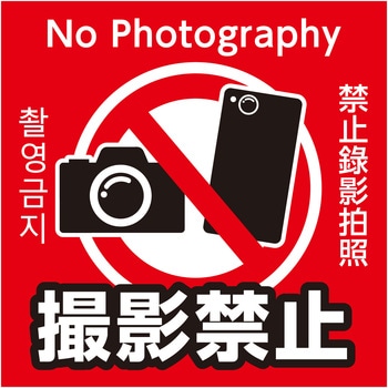 一目で伝わる!「撮影禁止」防水ステッカー!施設の入り口や壁面に貼るだけで無断撮影を防止できる「撮影禁止」ステッカーです。95×95mmの見やすいサイズと高い視認性で、遠くからでもしっかり注意喚起が可能です。防水加工と耐光インキにより屋外でも色あせしにくく、長期間使用できます。日本語に加え英語・韓国語・中国語表記とピクトグラムで、外国人にも直感的にルールを伝えられます。強粘着タイプでガラスや壁面にしっかり貼り付け可能です。店舗や施設、イベント会場など幅広い場所で活躍する実用的な注意喚起ステッカーです。