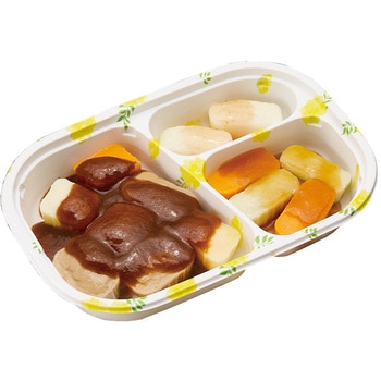 高栄養美味しさ簡便性にこだわったムース食のセットです。主菜1品副菜2品を組み合わせた昼夜向けのメニューです。トレイごと手軽に調理提供できます。主菜:ビーフシチュー(牛肉じゃがいもたまねぎにんじんのムース)/副菜(大):キャベツサラダ(キャベツにんじんのムース)/副菜(小):大根の梅和え(大根のムース)