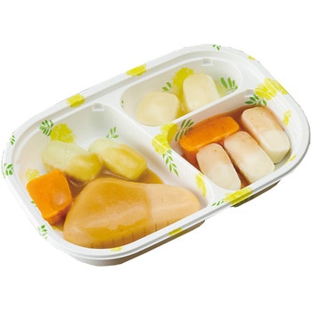 高栄養美味しさ簡便性にこだわったムース食のセットです。主菜1品副菜2品を組み合わせた昼夜向けのメニューです。トレイごと手軽に調理提供できます。主菜:ポークカレー(豚肉じゃがいもたまねぎにんじんのムース)/副菜(大):大根の酢の物(大根にんじんのムース)/副菜(小):いんげんのオーロラサラダ(いんげんのムース)