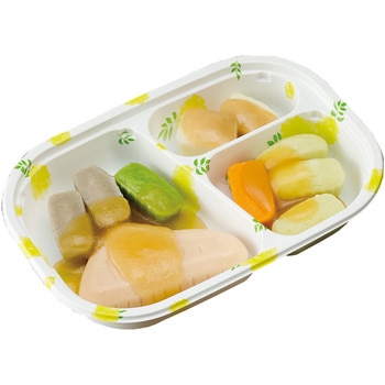 高栄養美味しさ簡便性にこだわったムース食のセットです。主菜1品副菜2品を組み合わせた昼夜向けのメニューです。トレイごと手軽に調理提供できます。主菜:鶏肉の中華炒め(鶏肉小松菜にんじん椎茸のムース)/副菜(大):野菜の甘酢あん(キャベツにんじんのムース)/副菜(小):さつまいものオレンジ煮(さつまいものムース)