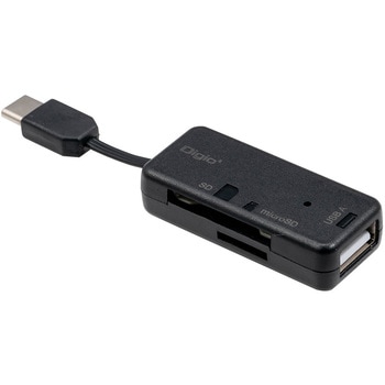 Type-C接続でmicroSD・SDカードを読み取れます。USB機器をType-Cに接続できる変換アダプタ機能付き。持ち運びやすいコンパクトタイプ。ケーブルを背面に固定できます。<ご使用上の注意>。SDとmicroSDの同時使用はできません。変換アダプタ機能とカードリーダー/ライター機能は同時使用できません。LightningポートのiPad、iphopneでは使用できません。