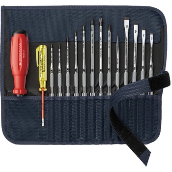 セット内容:差替式ドライバーハンドル(38215.A)、差替式マイナスドライバーブレード(215.C2・3・4・5)、差替式プラスドライバー(215.PH1・2)、検電用ドライバー(175.0-60N)、差替式リーマードライバーブレード(215.E)。ロールアップケース付き。 差替式スイスグリップEVOドライバーセット。耐久性のあるハンドルで楽に作業できます。