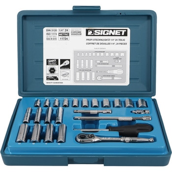 セット内容ソケット(6・7・8・9・10・11・12・13・14・15・16・17・18・19・21・22・24)mm、(12306・12307・12308・12309・12310・12311・12312・12313・12314・12315・12316・12317・12318・12319・12320・12322・12324)、ラチェットハンドル 全長230~345mm 72ギア (12582)、エクステンションバー 全長(75・150)mm (12506・12507)、T型ハンドル 200mm (12559)、ユニバーサルジョイント 全長52mm スプリング付き (12558)