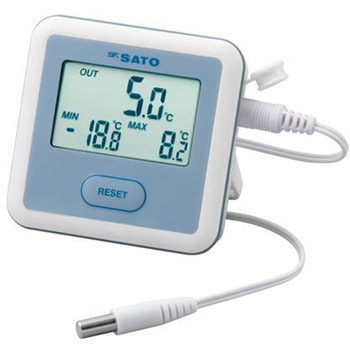 壁掛け、卓上、貼付け(磁石)の3通りの設置可能。現在温度、最高温度、最低温度を常時表示する冷蔵庫用デジタル温度計です。冷蔵庫内へ本体を設置することが可能です(冷凍庫内の測定は外部センサをご使用ください)。管理幅(例:2~5℃)を一目で把握できます。内蔵センサと外部センサを切り替えて使用が可能・外部センサ未接続:内蔵センサ(IN)の温度を表示・外部センサ接続時:外部センサ(OUT)の温度を表示(※外部センサを接続すると、内蔵センサ(IN)から外部センサ(OUT)の表示に自動で切り替わります)。外部センサはフラットケーブルを採用冷蔵庫、冷凍庫の扉の隙間に通したり挟んだりしやすいよう厚みの少ないフラットケーブルを使用しています。最高・最低温度の表示最高温度、最低温度を常時表示します。最高温度(MAX)、最低温度(MIN)の記憶は下記の操作により開始します。・電池をセット、または取り替えた場合・リセットボタンを押した場合。トレーサビリティ校正・JCSS校正:対応。