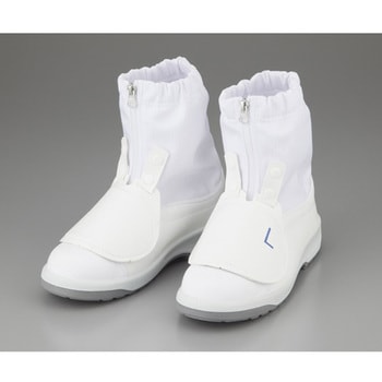 適度なフィルター性と通気性を併せ持ち表面強度にも優れた素材「プリータⅢ」素材をカバー部に使用しています。カバー部はロング丈で履き口にはマジックテープを使い塵埃の漏洩を防いでいます。ソールについては素材が特殊制電配合ウレタンを発砲した物を使い軽く、クッション性の良い物を使っています。また底厚にし靴底には運動の基点となる部分にサークルポイントを施し運動性も向上しています。また小指側の部分にゆとりがあり足に窮屈さを感じさせない設計をしており、ウィズについてもEEEを採用しています。また着地する際、最も先に地面と接する部分をあらかじめカットする事によりスムーズに動け、削れによる発塵源を取り除く様設計しています。除電システムについては導電糸入り中底、導電ラバー、制電配合ウレンタンソールを通して確実に除去します。(導電性能はJIS T8103適合)