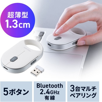 フックがついて持ち運びがしやすい超薄型のワイヤレスコンボマウスです。ケーブルを気にせず使えるワイヤレスタイプです。パソコン、タブレットなどいろいろ接続できるBluetoothと2.4GHzそしていざというときに有線でも使える究極のコンボマウス同時に使用することはできません。ワイドモニタにも最適な4000dpi対応。通信範囲が半径10mの広範囲で安定したデータ通信が可能です。スマートフォンやタブレットなどでも使用できます。Android OS搭載でもBluetoothマウスに対応していない場合があります。使用されている製品の仕様をよくご確認ください。不使用時の電池消耗を抑える、電源スイッチ付きです。