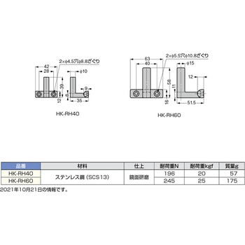 付属品HK-RH40:十字穴付バインドタッピンねじ4×20(ステンレス鋼)HK-RH60:十字穴付バインドタッピンねじ5×30(ステンレス鋼)材質ステンレス鋼(SCS13)種類標準仕上鏡面研磨取付け方法壁付け付加機能なしRoHS指令(10物質対応)対応