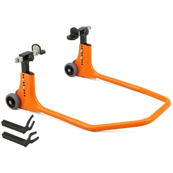 シャフトが中空の貫通アクスルシャフト用スタンド。リアホイールの脱着を伴わない作業(洗車やチェーンメンテナンス等)であれば、スイングアームからスタンドが外れないので、V字やL字受けより安心してリフトアップできるので初心者におすすめです。シャフト受け穴は上下2か所で、前後、上下約14mmのアジャストが可能。スイングアームよりアクスルナットが奥まった車両は、付属のカラーでクリアランス(片側2枚重ね最大約17mm)を保つことで、スタンドがスイングアームに当たる事を防げます。・Φ8シャフト(有効直線部450mm)・カラー2個(外径30mm×厚さ8.5mm)・シャフト受け穴2か所・リフトアップ量:280~355mm(受け下穴~受け上穴)・対応アーム幅:350~395mm(カラー使用時最大-17mm減)・耐荷重:200kg