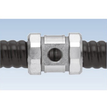 ケイフレックスとケイフレックスを接続するためのストレートカップリングで、ケイフレックス内部に溜った水を丸穴でドレンする構造です。表中の「接続できるケイフレックス」欄の※印はKMV、KMS、KIV、KIH、KPF、KIC、KMEC、KPBF(#10 除く)、KMB、KIB を表しています。ケイフレックスとカップリングの引張力は#10 は500N (JIS C 8461-23の分類コードは3 ミディアム)、#12~54 は1000N (JIS C 8461-23 の分類コードは4 ヘビー)、#70 以上は2500N ( JIS C 8461-23 の分類コードは5 ベリーヘビー) です。真鍮品はRoHS に対応していません。