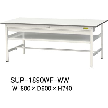 軽作業におすすめの汎用作業台!長尺物の収納に便利なワイド引き出し付き。さらに取付高さを調節できる中間棚付き。独自構造により組立しやすくスッキリな見た目と均等耐荷重150kgの安定性を実現!天板はRoHS2対応の低圧メラミン天板。表面硬度が高く摩耗に強いため、物流現場での梱包・検品・組立等の軽作業におすすめです。作業台高さは高さ740mmタイプと高さ950mmタイプの2種類をご用意。天板サイズは12種類、間口1800mm×奥行900mmの大型作業台から、間口900mm×奥行600mmの一人用作業台まで豊富にラインナップ!天板・脚部カラーはシルキーホワイト色。清潔感のあるシンプルデザインで、設置場所を選びません。店舗やオフィスでの作業テーブルとしてもおすすめ。天板表面のエンボス加工が光の反射を抑えるため、作業に集中しやすく作業効率アップに貢献します。天板芯材はパーチクルボードでたわみにくく、脚部はスチール製の角パイプ構造で丈夫な作業台です。ワイド引出しはワークテーブルの間口方向全面の引き出しで、事務用品や工具の収納、長尺物の収納にも使用でき便利です。フルオープンの引き出しで収納物が見やすく出し入れがしやすい。スライドレール付きのため開閉もスムーズです。25mmピッチで取付高さ調整可能な中間棚板付きで収納に便利。収納する物に合わせて使いやすい位置に中棚を設置できます。足元のツナギ(カンヌキ)は自由に位置変更が可能!奥側に取付すれば足元の空間を広々使えます。床置き収納スペースにも使えて便利。樹脂製アジャスターを標準装備!手回しで簡単に床レベルが調整でき、作業台を水平に保ちます。独自構造で簡単組み立て、しっかり安定!少ないボルトで組立がしやすく、かつ横揺れを防止します。