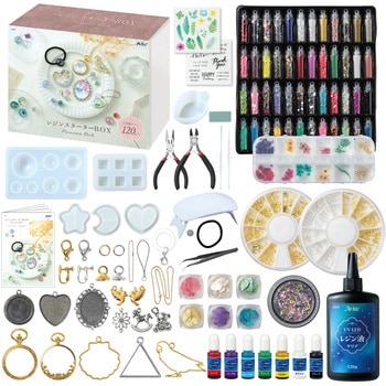 セット内容大容量レジン120g×1、レジン用着色剤各10ml×7色(レッド、パープル、スカイブルー、グリーン、イエロー、ホワイト、ブラック)、UV-LEDライト×1、ジェルマット×1、調色スティック×2、調色カップ×2、研磨パッド×1、精密ピンセット×1、平ヤットコ×1、ニッパー×1、モールド型×5、透明フィルム×1、キラキラ小瓶×48、シェルフレーク×6、ドライフラワー×12、メタルパーツ(シルバー&ゴールド)×24、デザインフィルム×2種、ミックスパーツセット×1、ミール皿×3、チャーム×5、空枠×5、アクセサリー用金具セット(カニカン、丸カン、ヒートンキャップ、ネックレスチェーン、イヤリング金具、アンブレラマーカー、ボールチェーン、ストラップ、ヘアゴム)×1、レジンのテクニックブック×1材質アクリル系光硬化樹脂、PET、合金、PU、合成樹脂、有機溶剤、ABS、PVC、特殊鋼(SK5)寸法(mm)283×80×220包装形態箱入り適合年齢(歳)8
