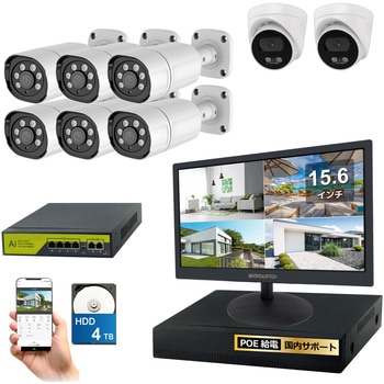 400万画素PoEタイプNVR防犯カメラセット バレットカメラ6台 ドームカメラ2台、15.6インチモニター、HDD4TB付きブロードウォッチ