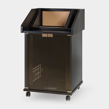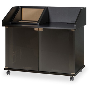 コンソール部手前は、奥行広々スペースなので、A4サイズの資料をそのまま置けます。コンソール収納部には、ミキサなどのEIA機器が収納できます。サブコンソール部にMFPを取り付けることができ、システムの変更や改修時にもMFPプレートの取り替えだけで対応できます。EIAコネクタパネルまたはEIA用端子盤フレームにコネクタ付きプレートMFPシリーズまたはEIA・側面端子盤プレートを取り付けることで、使い勝手のよい端子盤が製作できます。さまざまな種類のコネクタからお選びいただけます。棚板の取付位置は、EIAピッチで上下移動できるので、機器と棚板との隙間なく取り付けられます。EIA下付きとなります。棚板はオプション(別売)です。側板には、配線に応じたコネクタレイアウトの端子盤を取付可能。端子盤用の穴はノック穴構造なので、大掛かりな加工は必要ありません。卓側面端子盤を取り付けた場合の卓内配線がラクにできるように、スペースを拡げました。また、卓側面端子盤を取り付けない場合でも、機器間の配線ケーブルを這わせておくスペースとして活用できます。ABS樹脂にすることにより、利用者のベルトのバックルなどでの破損防止を高めております。ガラス扉は270度の角度で開閉します。機器を収納する時や収納した機器を操作する時に、ガラス扉が邪魔になりません。ガラス扉の鍵とマグネットラッチ受けを一体化しました。扉の開閉と施錠・解錠が同時にできます。扉を止めるマグネットはEIA実装部と間隔をあけ最上段からの機器実装が可能です。底板の配線孔には、スルーカバーがついています。ケーブルを通すとき、またはケーブルを接続したまま卓を移動するときに生じる、擦りキズを防止できます。底板配線孔(前面)手前の底板部分は着脱できます。機器にケーブルを接続した後からでも卓内に収納できるので、機器収納後に、卓内の狭い場所で配線作業をする必要はありません。高級感のある木目調のライトブラウン、何とでも合わせやすいホワイト、シックなブラックの3色を用意いたしました。