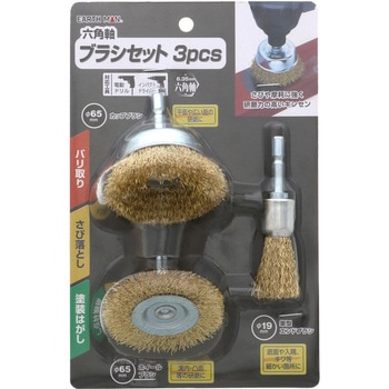 用途バリ取り・さび落とし・塗装はがしに カップブラシ:平面や広い面の研磨に ホイールブラシ:溝内・凸面等の研磨に 筆型エンドブラシ:底面や入隅、キワ等細かい箇所に付属品カップブラシΦ65mm×1 / ホイールブラシΦ65mm×1 / 筆型エンドブラシΦ19mm×1材質六角軸:クロムバナジウム鋼 ブラシ:キンセン(鋼線+真鍮メッキ)最高使用回転数(min-1[r.p.m])4500