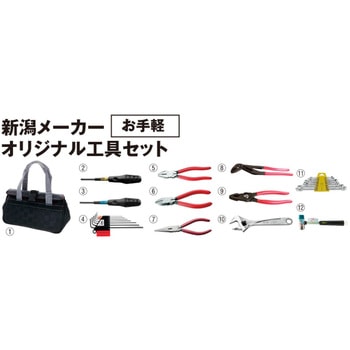 用途DIY・住まいのメンテナンス・暮らしのサポートにセット内容(メーカー/品名/品番)【髙儀(TAKAGI)/マルチツールバッグSS/ICB-1】 1個【アネックスツール/スリットパワードライバー/7700】 1本【アネックスツール/スリットパワードライバー/7700】 1本【TSUNODA(ツノダ)/TTC ペンチ(JIS)/TH-103DG】 1本【TSUNODA(ツノダ)/TTC 強力ニッパー(JIS)/TH-302DG】 1本【TSUNODA(ツノダ)/TTC ラジオペンチ/TH-202DG】 1本【TSUNODA(ツノダ)/JIS規格3枚合せウォーターポンププライヤー/TH-250WP】 1本【TSUNODA(ツノダ)/JISスリムプライヤー/ TH-150PL】 1本【トップ工業/ワークワイド(ガタ無しモンキーレンチ)/HM-38M】 1本【アネックスツール/ボールポイントレンチ7本組マグキャッチ付/HB1007】 1セット【ベストツール/PCケース入6丁組コンビレンチ JIS/KS-60P】 1本【長谷伸/ゴム&プラ コンビハンマー/-】 1本質量(kg)約3.1寸法(幅W×高さH×奥行D)(mm)【(収納バッグ】外寸:約280×170×160 本体内寸:約270×160×160入組点数12