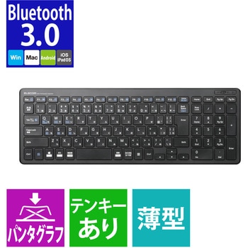 一枚板のように美しい無線の最薄部6.5mmのBluetooth(R)薄型コンパクトキーボードです。 省電力を実現するBluetooth(R)3.0 Class2規格に適合しており、ブルートゥースに対応したパソコンやタブレットであれば、レシーバ無しで接続できます。 ※Bluetooth(R)に対応していないパソコンやタブレットでも、規格に適合したBluetooth(R)アダプタを用意することで使用可能です。(推奨Bluetooth(R)アダプタ:LBT-UAN05C2(別売)) パソコンやタブレット、スマートフォンなど、最大3台までのデバイスをペアリング可能です。切り替えボタンを押すことで登録したデバイスを瞬時に切り替えることができます。 専用ドライバなどのインストールは不要で、ペアリングするだけですぐに使用可能です。 キータイプには、ノートパソコンのキーボードと同じ、軽い力で打鍵できる「パンタグラフ方式」を採用しています。 キートップ下に鉄板を内蔵することで、しっかりとした打ち心地と安定感を実現しています。 Windows OS/Android OS/Macintosh OS/iOSのそれぞれに最適化した入力モードを搭載しています。 コンパクトながら19mmのキーピッチと、日本語104キーを採用し、快適なタイピングが可能です。 キートップにはスタイリッシュで見やすいオリジナルフォントを使用しています。 ボリューム操作やメディアプレーヤーの操作などを専用キーを押すだけで実行できる13種類のマルチファンクションキーを搭載しています。 Android端末で、キーボードの印字通りのキー入力ができるエレコム独自のアプリ「ELECOM Keyboard layout」に対応しています。 外出先での使用にも安心な電池式です。 不使用時の電池の消耗を防止できる電源スイッチを搭載しています。 電源ON、ペアリング状況などが分かるLEDランプがついています。