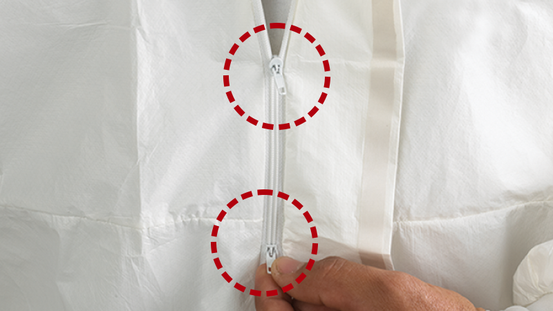 - ①高い通気性をもち、快適性に優れる、SMMMS構造の防護服。