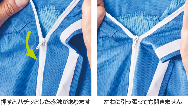 - ②格段の通気性”SSMMS不織布生地 SSMMS構造の不織布生地を使用しているので、フィルムタイプ生地と比較して格段に通気性があり、ムレや暑さによる身体へのリスクを軽減します。
